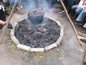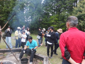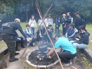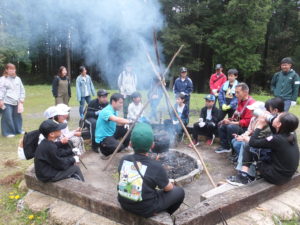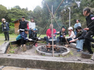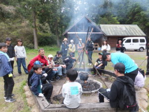 午後からは、キャンプファイヤーを囲んで歌ったり♪竹にウィンナーを刺して焼いて食べました。焼き芋も甘くて美味しかったです。